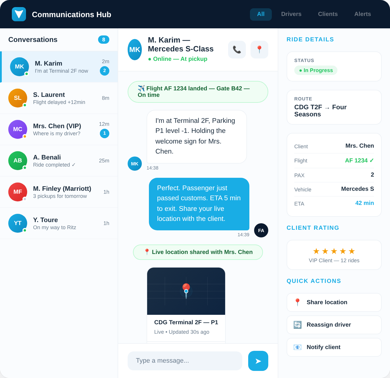 Départ, arrivée, prise en charge, dépose — chaque étape est tracée. Les retards de vol ajustent automatiquement l'heure.
